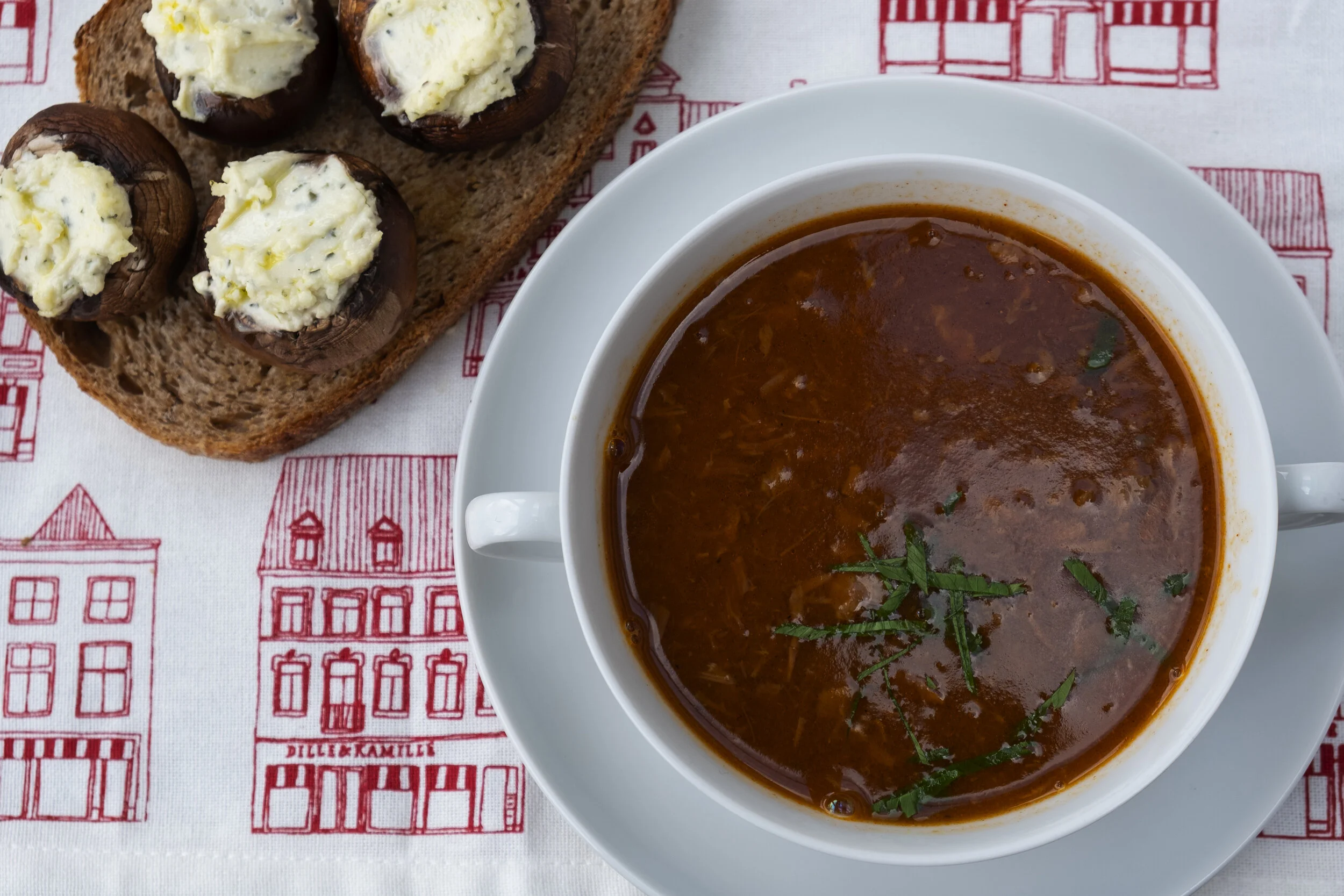 Deze soep is lekker met stoer brood en champignons gevuld met kruidenkaas die een paar minuten onder de hete grill hebben gestaan.