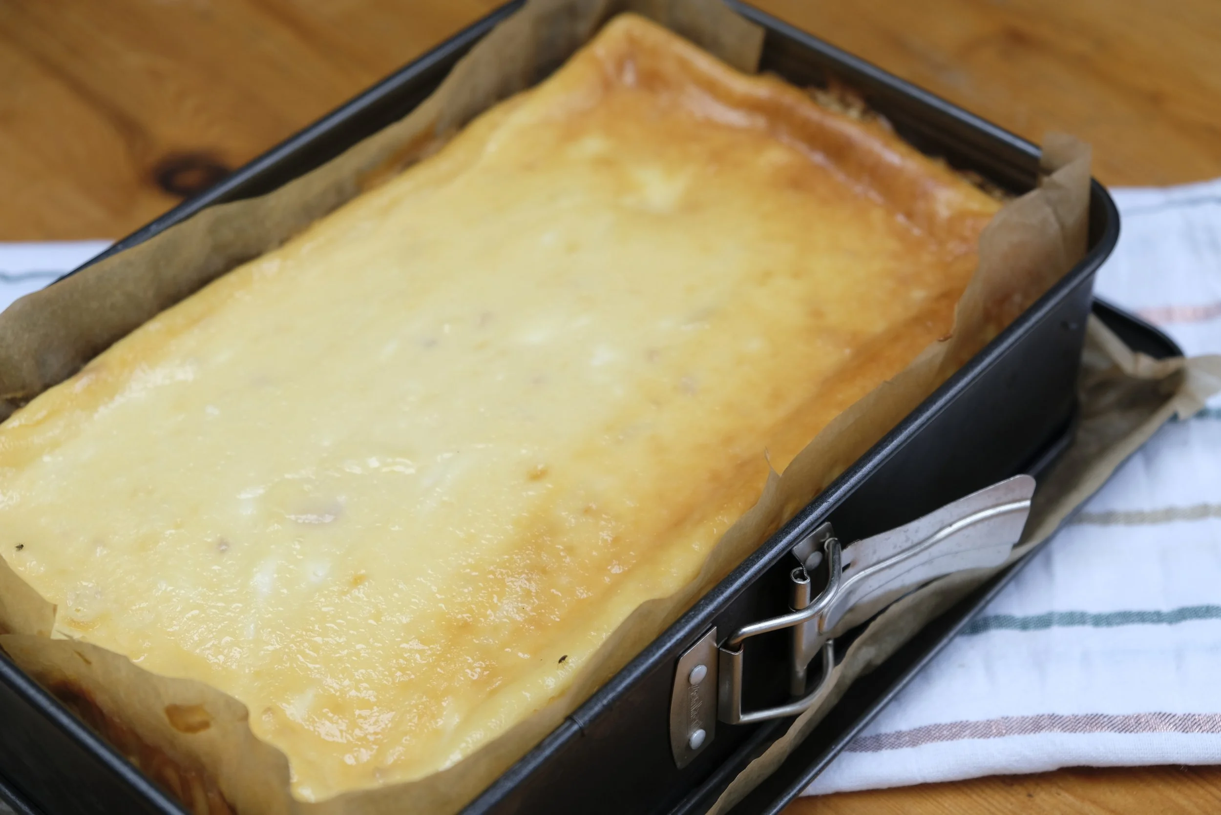 Extra nodig: springvorm van 23 cm Ø of zoals op de foto een rechthoekige vorm van 18 bij 27 cm.