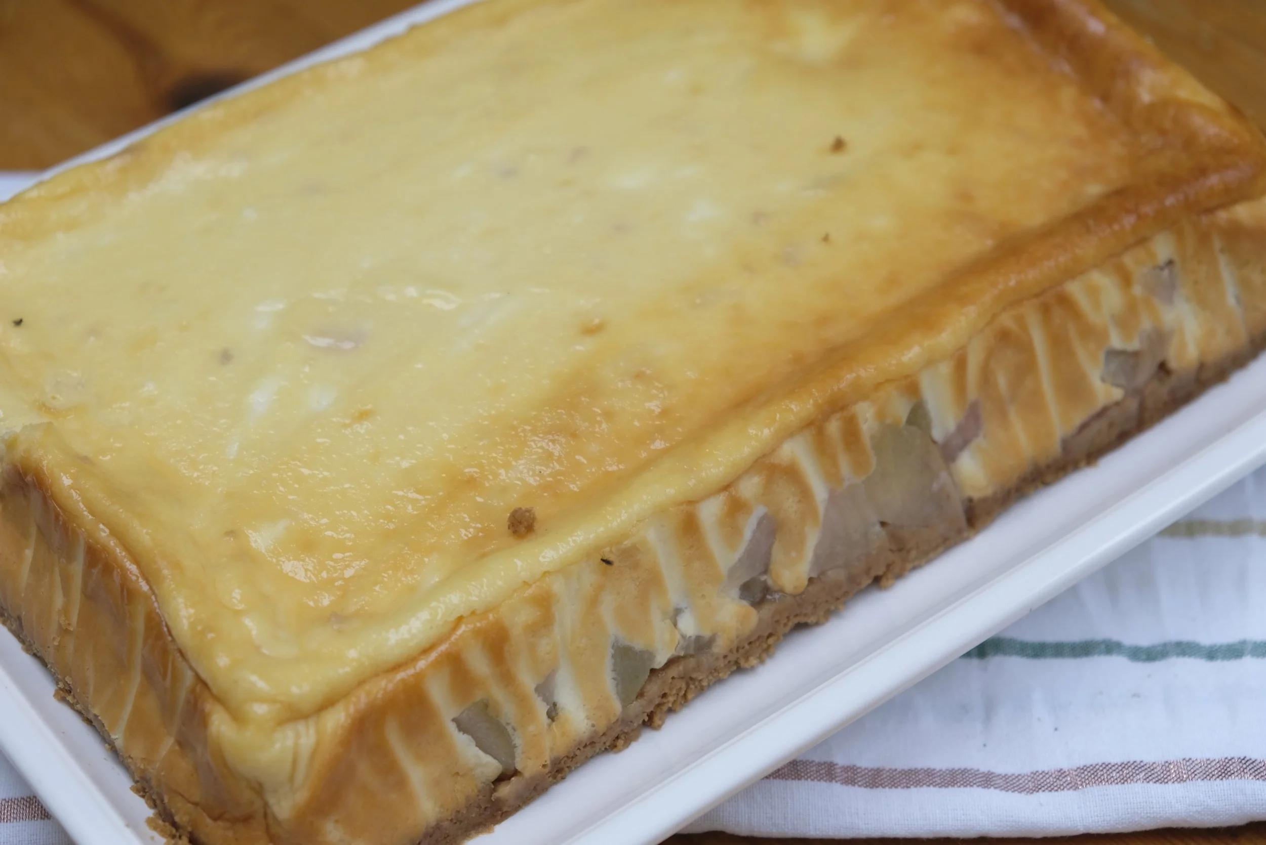 Verwijder de springvorm, daarna kun je de kanten strak bijsnijden. De laag peren komt dan mooi in zicht.