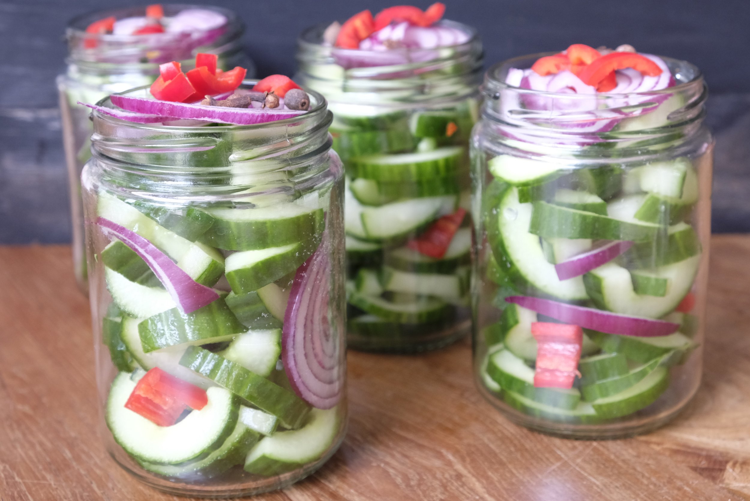 Verdeel de komkommer, rode ui, peper, pimentkorrels en kruidnagels over de potjes.